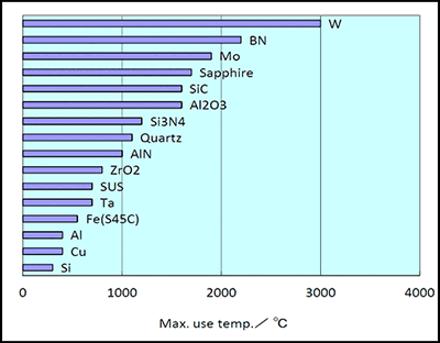 The maximum use temperature determines the temperature range in which a material is possible to use. It varies depending on atmosphere. Materials with high melting point such as tungsten, molybdenum and ceramics have various applications which require high heat resistance. For example, furnance materials, crucibles, and heat shielding.