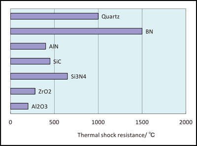 Temperature range in which a material can withstand rapid changes in temperature. The higher the thermal shock resistance is, the lower the risk the material breaks due to rapid temperature changes. Glass and ceramics are easy to break with abrupt temperature change. However, boron nitride, quartz, and silicon nitride have a very high thermal shock resistance. These materials are frequently used in parts that are required to withstand extreme temperature fluctuation.